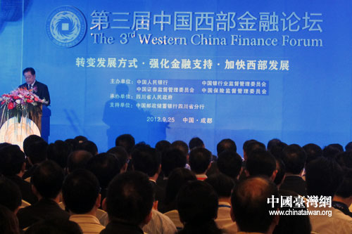 中國臺灣網(wǎng)9月26日成都消息 25日上午9時,第三屆中國西部金融論壇在成都召開,中國人民銀行、中國銀監(jiān)會、中國證監(jiān)會和中國保監(jiān)會等相關負責人及境內外金融界代表500余人出席論壇,四川省委副書記、省長蔣巨峰在主論壇上致辭并發(fā)表演講。