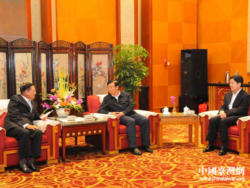 四川省委副書(shū)記李春城(中)、副省長(zhǎng)甘霖(右)會(huì)見(jiàn)江丙坤(左)。圖片來(lái)源:四川省臺(tái)辦