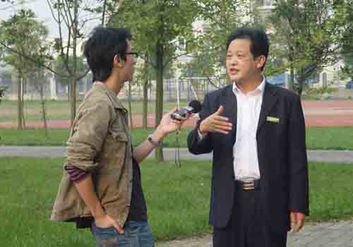 記者采訪洛水慈濟中學(xué)校長徐開全。(德陽市臺辦 尹顯斌 攝)