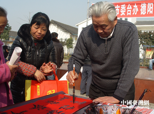 臺屬書法家揮毫潑墨為村民寫春聯(lián)。(德陽市臺辦 甘和林 攝)