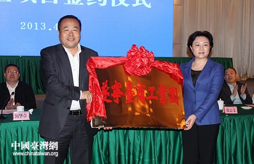 四川省政府副秘書(shū)長(zhǎng)吳顯奎(左)為遂寧授“遂寧臺(tái)商工業(yè)園”牌匾,遂寧市副市長(zhǎng)鄧為(右)接牌。(圖片來(lái)源:四川省臺(tái)辦)