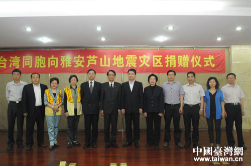 4月27日下午,臺灣同胞向四川蘆山地震災區(qū)捐贈儀式在四川成都舉行。 圖片來源:四川省臺辦