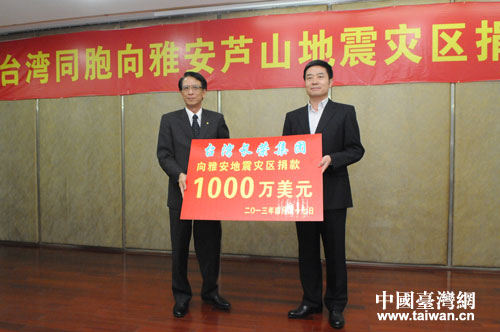 捐贈儀式上,長榮集團捐款1000萬美金(約合6170萬元人民幣),是目前向雅安蘆山地震災區(qū)捐款數(shù)額最多的臺資企業(yè);大潤發(fā)捐贈1000萬元人民幣,包括300萬元資金和700萬元物資;臺灣宗教團體佛光山捐款1000萬新臺幣(約合208萬元人民幣);新光三越百貨股份有限公司捐款100萬元人民幣。四川省副省長甘霖出席捐贈儀式,并代表四川省人民政府接受臺灣同胞捐贈。