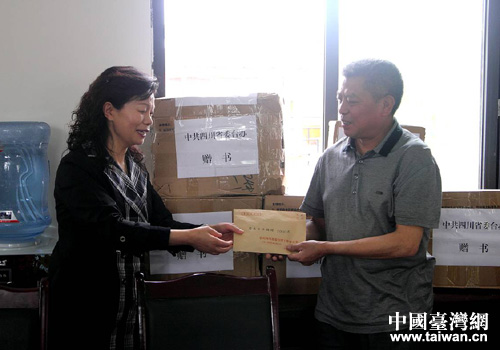 四川省臺辦巡視員楊永培(左)代表省臺辦機關(guān)黨委向李冰村黨支部捐贈黨費和圖書。(圖片來源:四川省臺辦)