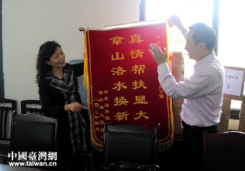 洛水鎮(zhèn)黨委、政府向省臺辦贈送“真情幫扶顯大愛,章山洛水換新顏”錦旗。(圖片來源:四川省臺辦)