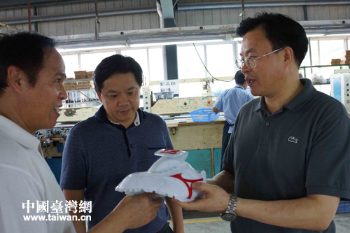 張軍詳細(xì)詢問中江臺(tái)企宏和鞋業(yè)產(chǎn)品生產(chǎn)情況。(德陽(yáng)市臺(tái)辦 尹顯斌 攝)