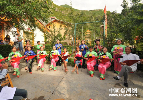 在菜園村,果樹林立、鮮花掩映、整潔優(yōu)美、民族特色鮮明的環(huán)境給兩岸媒體記者留下了深刻印象。記者們走進村寨采訪10戶村民以聯(lián)戶經(jīng)營模式發(fā)展農(nóng)家樂的故事,欣賞藏羌特色刺繡和極具當?shù)孛褡逦幕厣墓?jié)目表演,特別是國家級非物質(zhì)文化遺產(chǎn)南坪曲子傳承人黃德成及當?shù)厝罕姽餐瑥棾硌莸哪掀呵幼尨蠹屹澆唤^口。(中國臺灣網(wǎng)、四川省臺辦聯(lián)合報道)