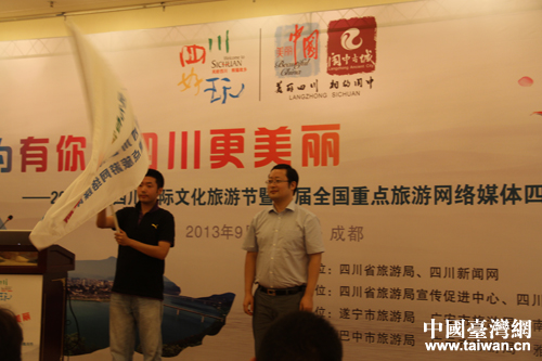 中共四川省委宣傳部網(wǎng)宣處副處長鄭偉強先生向媒體代表授旗。(中國臺灣網(wǎng) 樊玉嬌 攝)