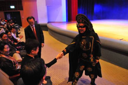 川劇變臉演員李艷冬與臺(tái)下觀眾互動(dòng)。