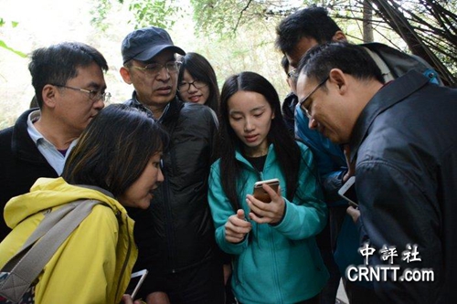 中評社采訪團在成都大熊貓繁殖研究基地,圍著解說員看繁殖紀錄。(中評社 趙家麟攝)