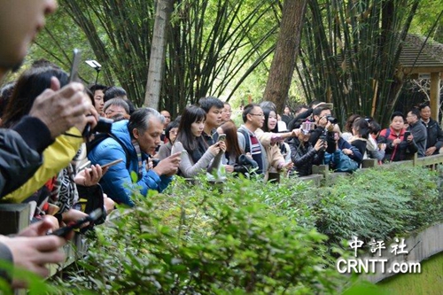 成都大熊貓的一舉一動,吸引無數(shù)觀光客的目光。(中評社 趙家麟攝)