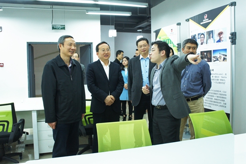 四川省臺(tái)辦主任周敏謙(左一)在“亞臺(tái)青(成都)海峽青年創(chuàng)業(yè)園”調(diào)研