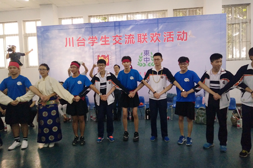 民樂演奏、藏族舞表演,為了歡迎遠(yuǎn)道而來的結(jié)對伙伴,樂山一中的同學(xué)們送上了精心準(zhǔn)備的節(jié)目。臺東高中的同學(xué)們也禮尚往來,表演了獨具特色的臺灣少數(shù)民族歌謠。兩校學(xué)生手拉手跳起舞,將交流聯(lián)歡活動推向高潮。