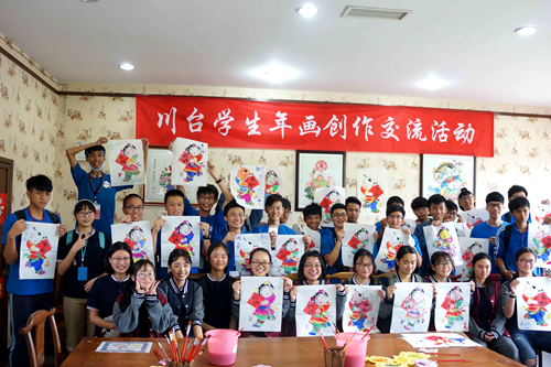 在處處裝點著中國傳統(tǒng)年畫的綿竹年畫村,同學們細心聆聽綿竹年畫的文化傳承、制作流程、工藝技巧、創(chuàng)作理念等介紹,切身感悟到一幅幅經典畫作中所蘊含的民間智慧與精湛技藝。在年畫老師的指導下,臺東高中的同學們爭相一試身手,與綿竹中學的同學們共同創(chuàng)作年畫,描紅、上色,互贈作品作為紀念,描繪出一幅跨越海峽的友誼之圖。