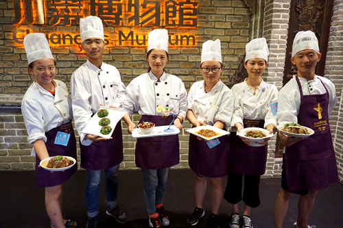 一進博物館,四川美食之都的淵源就呈現(xiàn)在同學(xué)們面前。作為世界唯一以菜系文化為陳列內(nèi)容的活態(tài)主題博物館,這里陳列著不少老四川的寶貝:戰(zhàn)國時期至今的3000多件川菜飲食器皿、與川菜有關(guān)的文字書籍和圖稿、全國最大的灶王祠、川菜與歷史文化名人背后的故事……川菜之魂——郫縣豆瓣的制作現(xiàn)場更是壯觀。上百口大缸整齊排列,揭開蓋子,濃郁的醬香撲鼻而來,赤紅的豆瓣讓人食欲大開。讓同學(xué)們在視覺、味覺上感受到川菜文化的博大精深與獨特魅力。