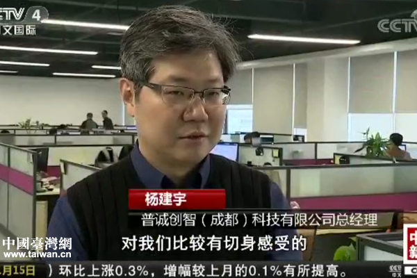 央視記者采訪(fǎng)普誠(chéng)創(chuàng)智(成都)科技有限公司總經(jīng)理?xiàng)罱ㄓ。(圖片來(lái)源:四川省臺(tái)辦)
