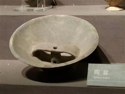 在陳列館“遠古家園”展廳中,有一堆陶器,其中有一個只寫著“陶盆”二字的陶器吸引了記者的注意!斑@個陶盆,我們沒有找到任何歷史記載,造型也很特別,根本無從考究它的作用!彪S著姚凱手指指引,記者看到,陶盆正中間呈圓柱形,前后各一個小孔,圓柱頂端有一個衡梁,正中也有一個小孔,三個孔互相相通。