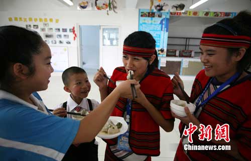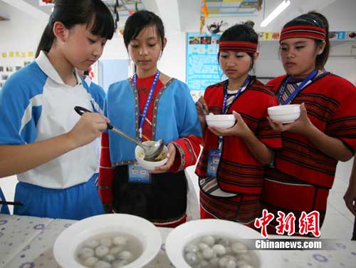 28日下午,受中共四川省委書記劉奇葆邀請(qǐng),由臺(tái)灣民意代表馬文君率領(lǐng)的臺(tái)灣“9·21”地震災(zāi)區(qū)和“8·8”風(fēng)災(zāi)災(zāi)區(qū)125名師生組成的“臺(tái)灣學(xué)生天府夏令營”正式開營,成都泡桐樹小學(xué)的學(xué)生與臺(tái)灣學(xué)生一起包餃子、吃湯圓。學(xué)生們說:“餃子和湯圓代表著團(tuán)團(tuán)圓圓。”(記者劉忠俊)