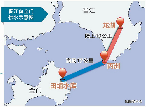 福建向金門供水工程水源取自泉州市晉江流域,由晉江金雞攔河閘引水至?xí)x江市龍湖水庫,經(jīng)龍湖抽水泵站抽水輸水至圍頭入海點(diǎn),再經(jīng)海底管道輸送至金門,輸水線路總長(zhǎng)27.56公里,其中福建方面陸地管道11.6公里、海底管道15.76公里,金門方面陸地管道0.2公里,工程總投資3.878億元。福建方面負(fù)責(zé)龍湖取水泵站、龍湖水庫至丙洲入海點(diǎn)的供水設(shè)施建設(shè),金門方面負(fù)責(zé)從丙洲入海點(diǎn)至田埔水庫的購(gòu)水設(shè)施建設(shè),即海底管線由金門方全段出資、建設(shè)和營(yíng)運(yùn)。工程設(shè)計(jì)日供水規(guī)模3.4萬立方米,通水后,福建將按計(jì)劃每天24小時(shí)連續(xù)供水。目前,大陸段已完成投資1.1億元,占大陸段工程總投資的87.8%。
