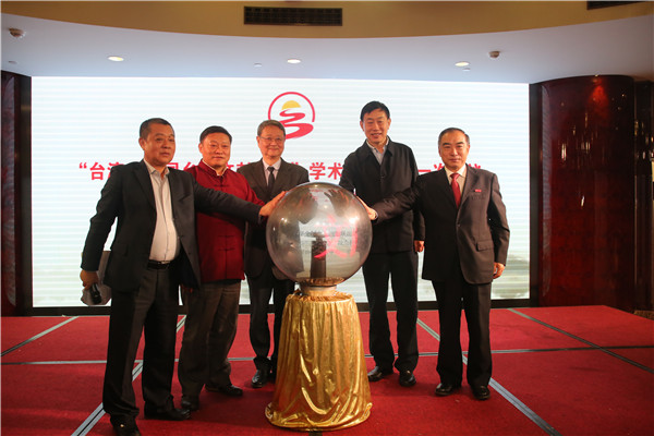 與會嘉賓共同按下啟動球(左起:謝壽光、龔鵬程、汪毅夫、李培林、賈益民)(圖片來源:華僑大學(xué))