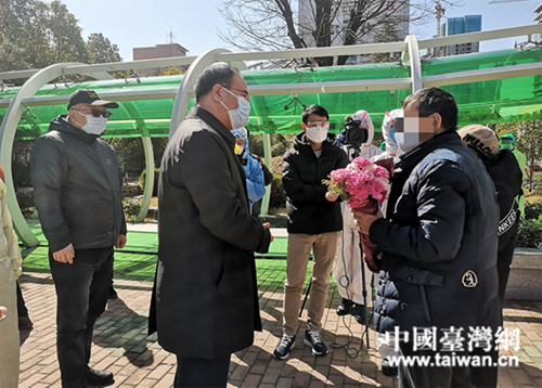 圖為湖北省臺辦主任李建紅(右一)在武漢協(xié)和醫(yī)院迎接痊愈出院的臺胞金先生(黃衣者)。(來源:湖北省臺辦)