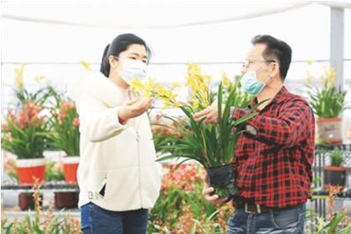 安徽廬江臺灣農(nóng)民創(chuàng)業(yè)園開展“四送一服”活動,及時協(xié)調(diào)解決臺企復工復產(chǎn)中的困難和問題。圖為創(chuàng)業(yè)園工作人員(左)在臺企安徽蘭世界農(nóng)業(yè)科技有限公司幫助落實小額貸款,解決蘭花銷售問題。柳曉華攝(人民圖片)