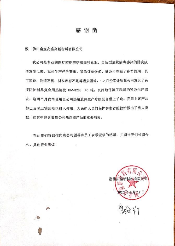 佛山日?qǐng)?bào)訊 記者劉偉 通訊員吳永升、謝坤報(bào)道 “感謝貴公司克服物流不暢、材料庫(kù)存不足等諸多困難,發(fā)運(yùn)醫(yī)療防護(hù)制品復(fù)合用熱熔膠!薄捌诖L(zhǎng)期合作,共創(chuàng)行業(yè)輝煌!薄3月以來(lái),佛山南寶高盛高新材料有限公司已收到十幾封感謝信,來(lái)自全國(guó)各地一些重要的防護(hù)服和手術(shù)衣面料復(fù)合企業(yè),感謝南寶樹(shù)脂在過(guò)去兩個(gè)月克服各種困難,及時(shí)足量供應(yīng)防護(hù)面料必須使用的熱熔膠材料。