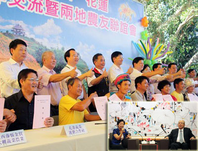 25日,廣西與臺(tái)灣花蓮農(nóng)產(chǎn)品貿(mào)易對(duì)接會(huì)暨啟運(yùn)儀式在花蓮農(nóng)業(yè)職業(yè)技術(shù)學(xué)校舉行。25日,廣西政協(xié)主席陳際瓦在臺(tái)灣花蓮出席廣西與花蓮農(nóng)業(yè)合作交流,見(jiàn)證兩地多個(gè)蔬果產(chǎn)銷班簽署對(duì)口交流備忘錄。