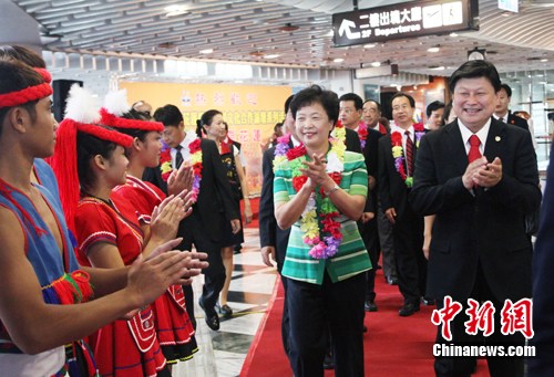 廣西再組千人代表團訪臺 24日,廣西壯族自治區(qū)政協(xié)主席陳際瓦乘包機抵花蓮,展開為期6天的訪臺行程。這是這是廣西連續(xù)第4年,由自治區(qū)主要負責人率千人團赴臺舉辦大型綜合性經(jīng)貿(mào)文化系列交流活動,展現(xiàn)廣西推動桂臺經(jīng)貿(mào)文化交流合作的誠意。 圖為陳際瓦抵臺受到花蓮少數(shù)民族同胞的歡迎。黃少華 攝