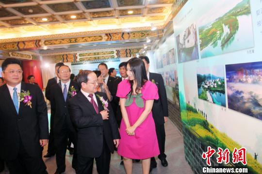 8月21日,“江西旅游風(fēng)光展”在臺北開幕。作為臺灣江西周一部分,展覽以精美的圖片向臺灣民眾介紹江西特有的風(fēng)光,期待贛臺兩地民眾互訪旅游。圖為江西省長鹿心社與其他嘉賓一起參觀展覽。黃少華攝
