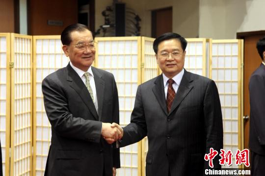 5月7日下午,湖北省代表團(tuán)來(lái)臺(tái)參訪(fǎng)抵達(dá)桃園機(jī)場(chǎng)。部分成員隨后即前往國(guó)民黨智庫(kù),會(huì)見(jiàn)中國(guó)國(guó)民黨榮譽(yù)主席連戰(zhàn)等。圖為中國(guó)國(guó)民黨榮譽(yù)主席連戰(zhàn)(左)會(huì)見(jiàn)湖北省省長(zhǎng)王國(guó)生。陳立宇 攝