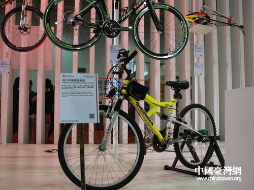 自行車綠能發(fā)電機(jī),可將電力儲(chǔ)存到行動(dòng)電源,供應(yīng)手機(jī)、ipad等小3C充電使用。(中國臺(tái)灣網(wǎng) 宿靜 攝)