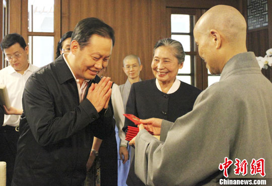 4月24日,佛教高僧證嚴(yán)法師在臺灣花蓮會見訪臺的中共廣西壯族自治區(qū)委員會書記彭清華一行。圖為證嚴(yán)法師向彭清華贈送;奂t包。中新社發(fā) 周群 攝