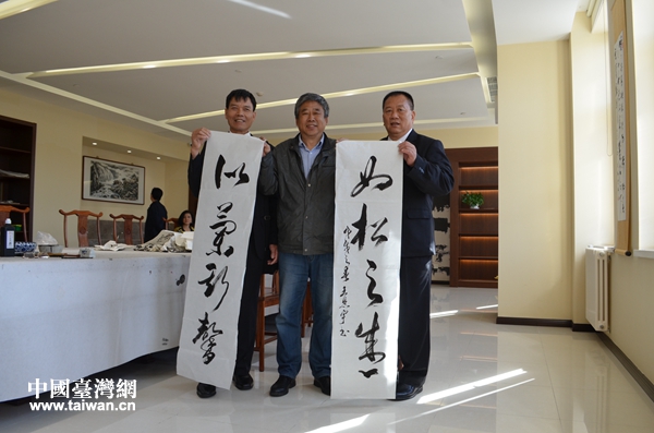 贈送書法作品。(圖片來源:濱海新區(qū)臺辦)