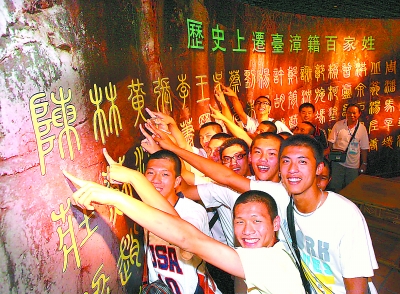 “根在海這邊”——參觀閩臺(tái)族譜對(duì)接館,臺(tái)灣學(xué)生在歷史上遷臺(tái)漳籍百家姓上找到了自己的姓氏。(記者 祝敏松 攝)。