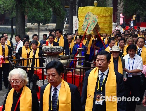 據(jù)臺灣《中國時報》報道,昨日上午,《孔子世家譜》續(xù)修告成頒譜儀式開始,來自世界各地的孔子后裔代表、政府官員及學者專家等共同參與。揭譜后,孔子第七十七代孫孔德墉還將整套《孔子世家譜》增送給兩岸圖書館、曲阜市人民政府。