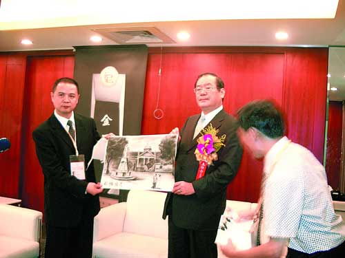 國民黨副主席曾永權(quán)(右)代表連戰(zhàn)先生在臺(tái)灣接受這份禮物。通訊員 瑞鳴攝影報(bào)道