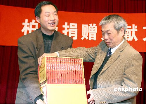 資料圖:2007年2月6日,“柏楊捐贈文獻文物入藏新聞發(fā)布會”在北京中國現(xiàn)代文學(xué)館舉行,中國現(xiàn)代文學(xué)館館長陳建功(右)代表文學(xué)館現(xiàn)場接受了捐贈的《柏楊版資治通鑒》。 中新社發(fā) 廖文靜 攝