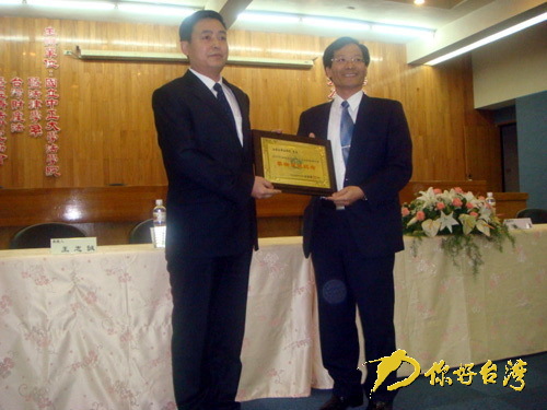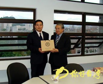 山東大學(xué)法學(xué)院齊延平院長(zhǎng)(左)向臺(tái)灣朋友贈(zèng)送禮品(你好臺(tái)灣網(wǎng) 圖)