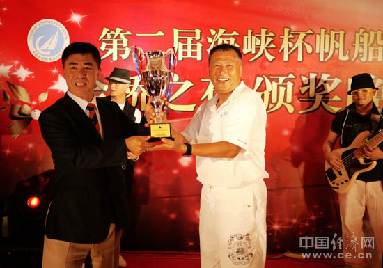中國(guó)帆船帆板運(yùn)動(dòng)協(xié)會(huì)副主席李全海為獲獎(jiǎng)帆船頒獎(jiǎng)。(中國(guó)經(jīng)濟(jì)網(wǎng)記者何東憲 攝)