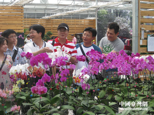 臺灣青年創(chuàng)業(yè)協(xié)會十杰基金會訪問團一行高興地談?wù)撨@是“胡總書記今年參觀過的蘭花品種”。(漳浦縣臺辦 陳文亮 攝)