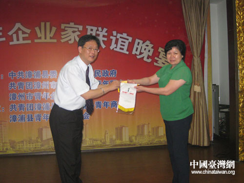 臺灣青年創(chuàng)業(yè)協(xié)會十杰基金會向漳浦縣副縣長王彩云(右)贈送“青年動手 人類希望”的圖標。(漳浦縣臺辦 陳文亮 攝)