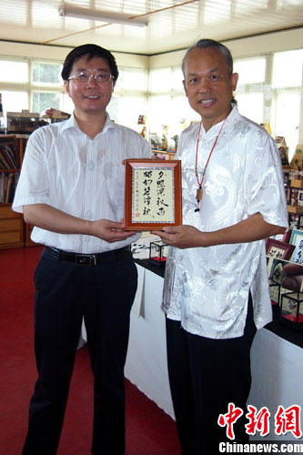 圖片說明:江蘇大豐市赴臺參訪團近日在臺北縣新店市長王美月的陪同下到臺北縣陳逢顯毫芒雕刻館參觀訪問,圖為臺灣著名微雕家、館長陳逢顯(右)向江蘇大豐市市長陳平贈送書法。作者:陳文