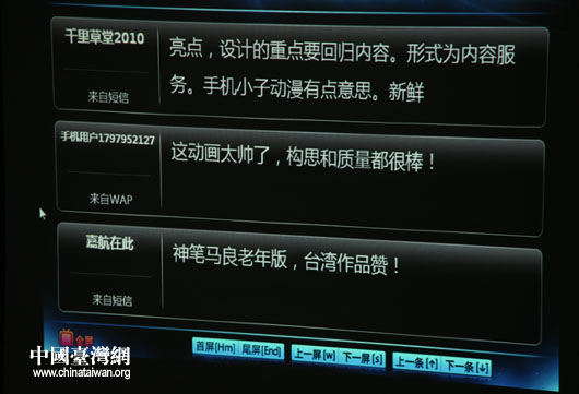 臺灣賽區(qū)入圍動漫受到現(xiàn)場嘉賓好評,大家紛紛通過現(xiàn)場的新浪微博直播互動平臺留言稱贊。(中國臺灣網(wǎng) 發(fā))