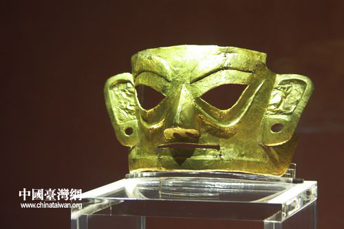 高11厘米、寬19.5厘米的黃金面具,是迄今大陸發(fā)現(xiàn)的保存最完整、最大的一件金面具。它陳列于金沙遺址博物館的“千年絕唱”精品文物廳中,與“太陽神鳥”互相輝映。(中國臺灣網(wǎng) 馬迪 攝)