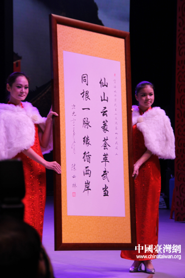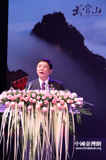 海峽兩岸關(guān)系協(xié)會(huì)會(huì)長(zhǎng)陳云林題詞:“仙山云篆,薈萃武當(dāng),同根一脈,緣循兩岸”。(中國(guó)臺(tái)灣網(wǎng) 李丹 攝)
