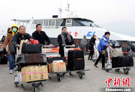 隨著農(nóng)歷兔年春節(jié)臨近,祖籍福建的臺(tái)胞也加快了返鄉(xiāng)過(guò)年的步伐。30日下午3點(diǎn)30分左右,“金龍輪”載著24名旅客從馬祖抵達(dá)福州馬尾對(duì)臺(tái)客運(yùn)碼頭,這是“兩馬”航線當(dāng)天的最后一個(gè)航班。