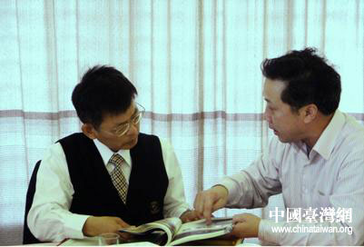 浦東新區(qū)臺(tái)辦副主任范桂國(guó)向楊秋興介紹浦東情況。圖片來源:浦東新區(qū)臺(tái)辦