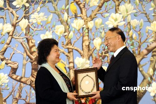 資料圖:2009年5月22日,國家體育總局局長劉鵬在北京飯店會(huì)見高雄市長陳菊時(shí),陳菊向劉鵬贈(zèng)送臺(tái)灣原住民首飾禮品。 中新社發(fā) 廖攀 攝