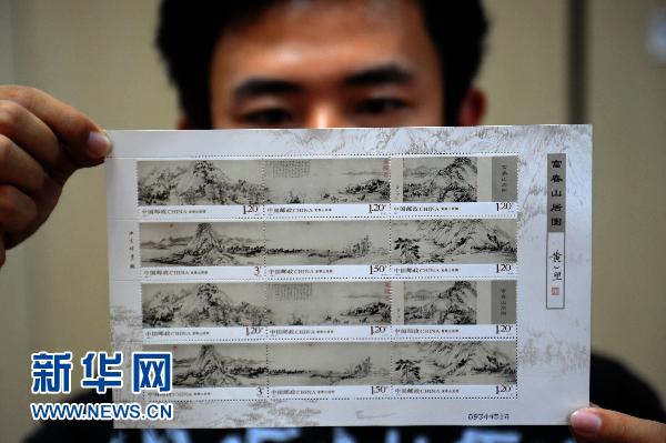 這是2010年《富春山居圖》成畫660周年之際首發(fā)的《富春山居圖》特種郵票。該郵票以《富春山居圖》整幅畫卷為藍(lán)本(5月11日攝)。當(dāng)日,元代黃公望《富春山居圖》(剩山圖)在浙江省博物館點交啟運,將經(jīng)由北京后赴臺,于6月1日在“山水合壁——黃公望與《富春山居圖》特展”上,與臺北故宮博物院所藏《富春山居圖》(無用師卷)聯(lián)合展出。這將是該畫作兩部分在分別360年后首次實現(xiàn)合璧。新華社記者 韓傳號 攝